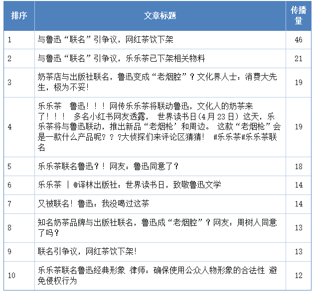 从有关“乐乐茶联名鲁迅翻车事件”的热门文章排行情况可知,2024年04月19日00时至2024年04月29日14时,《与鲁迅“联名”引争议,网红茶饮下架》、《与鲁迅“联名”引争议,乐乐茶已下架相关物料》、《奶茶店与出版社联名,鲁迅变成“老烟腔”?文化界人士:消费大先生,极为不妥!》等文章引媒体热载。此外还有,《乐乐茶✖️鲁迅!!!》、《乐乐茶联名鲁迅?!网友:鲁迅同意了?》、《乐乐茶 | @译林出版社:世界读书日,致敬鲁迅文学》等报道被广泛传播。