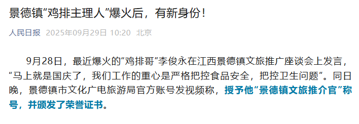 人人都能当“造景师”:不用花钱,员工拍个日常、顾客发个好评,就能把品牌带火。福州“鸡排哥”就是例子,没投一分广告费,顾客拍他“学生减1块”“炸焦就免单”的视频,直接把他捧成“良心老板”,销量从每天30份涨到500份,还被当地文旅局请去当“景德镇文旅推介官”;