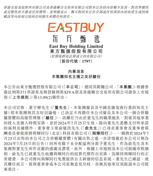 7月25日,东方甄选在港交所公告,董宇辉已决定不再担任公司雇员及公司一个合并联属实体的高级管理层,该离任乃由于董宇辉的职业抱负、对彼其他事业的投入及个人时间安排并于2024年7月25日生效。