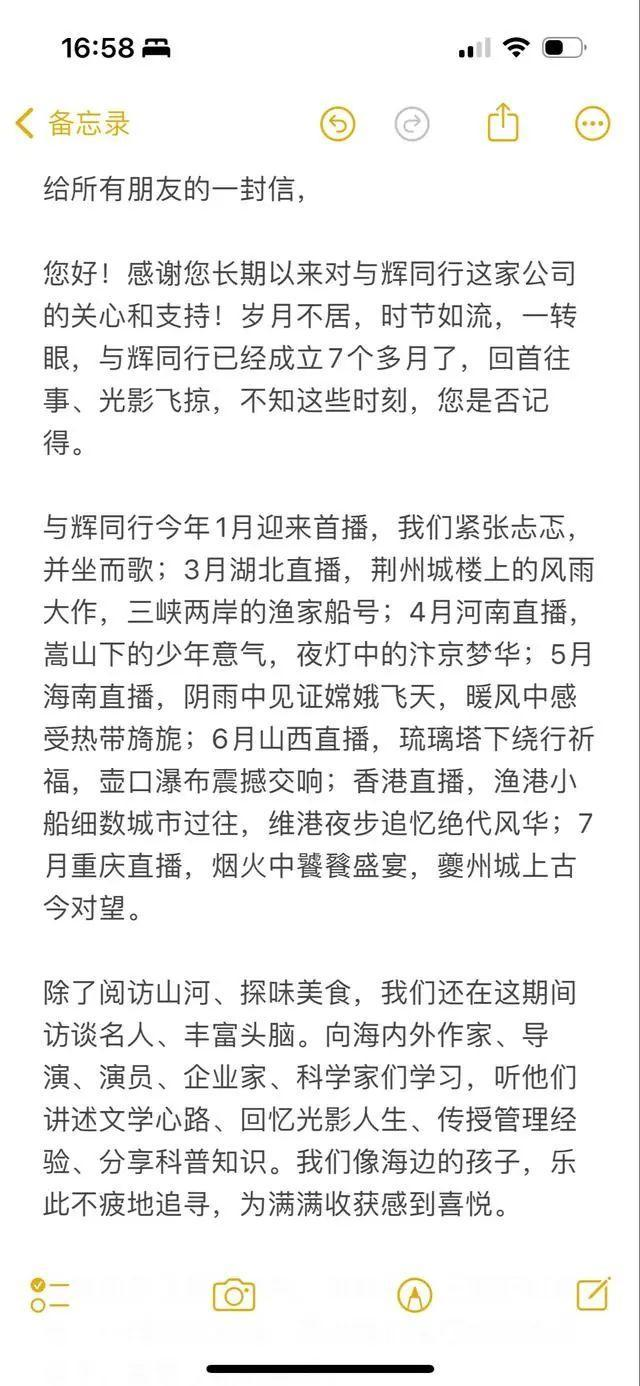 7月25日,俞敏洪在其个人公众号上发布了《致东方甄选股东朋友的一封公开信》,信中确认从今天开始,东方甄选的全资子公司与辉同行,将正式从东方甄选独立出去,由董宇辉个人持有其100%股权。与辉同行就要独立了,为了向宇辉表示感谢,除了已经支付承诺的全部待遇,俞敏洪已恳请董事会及薪酬委员会并取得同意,把与辉同行的全部净利润奖励给董宇辉。同时,董宇辉持有与辉同行所需的股权购买款,也按符合上市公司规则和公司章程规定的方式予以安排支付。为了确保与辉同行业务的正常运营,东方甄选经董事会同意将研发好的信息系统无偿交付与辉同行使用。