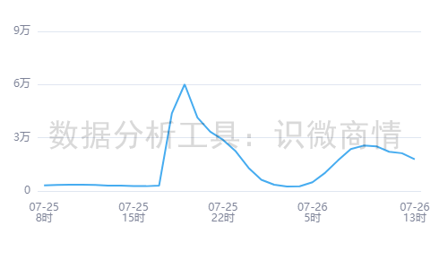 根据识微商情舆情分析系统显示,2024年07月25日08时至2024年07月26日13时,有关“董宇辉”的舆情热度约为45.7万,展现了顶流带货主播的流量实力。通过观察趋势可知,舆情于07月25日19时达到最高峰。