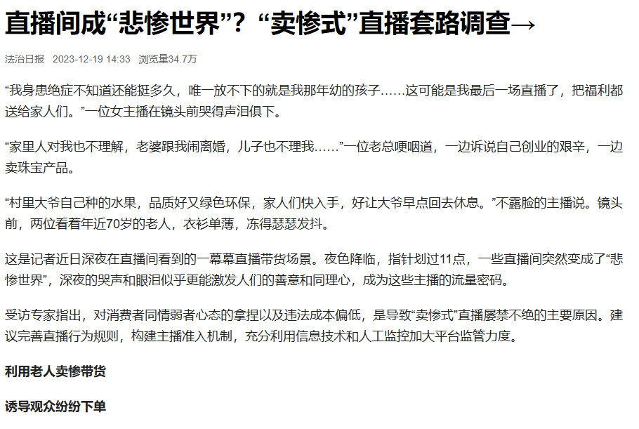 2023年底法治日报发布的《直播间成“悲惨世界”?“卖惨式”直播套路调查→》揭露了类似案例。