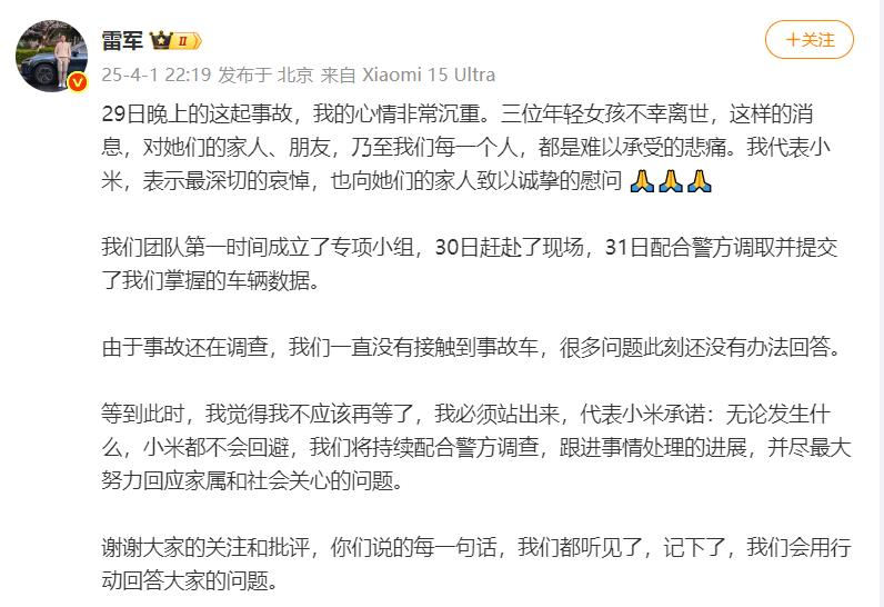 2025年3月29日小米SU7高速起火致三人遇难事件发生后,雷军于4月1日亲自通过微 博回应,表达哀悼并承诺“不回避、全力配合调查”,进一步拉高了公众与米粉的期待;