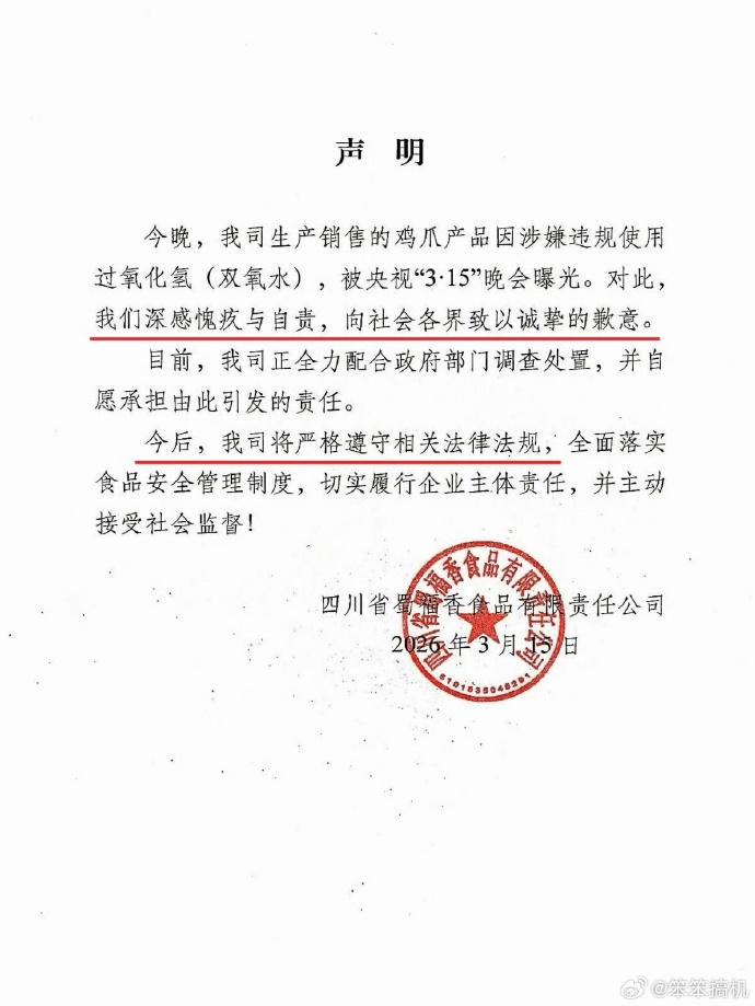 3月15日,四川省蜀福香食品有限责任公司发声明,“我们深感愧疚与自责,向社会各界致以诚挚的歉意。目前,我司正全力配合政府部门调查处置,并自愿承担由此引发的责任。今后,我司将严格遵守相关法律法规,全面落实食品安全管理制度,切实履行企业主体责任,并主动接受社会监督!”