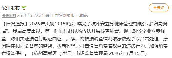 3月15日22时31分,“滨江发布”发布消息称,杭州高新区(滨江)市场监督管理局对央视“3·15晚会”曝光的杭州安立身健康管理有限公司“增高骗局”现已对该企业立案调查,对相关证据进行取证固证。后续,将根据调查情况依法依规予以严肃处理。
