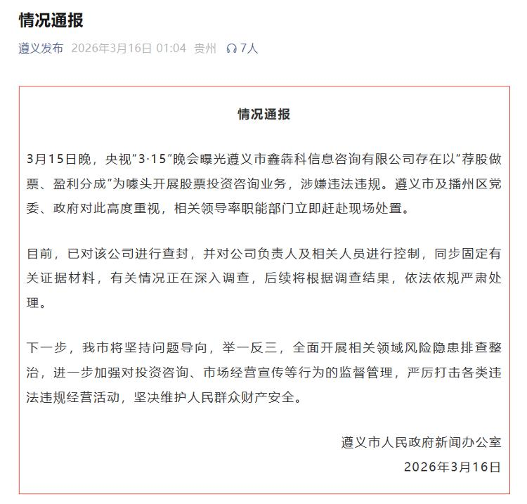 3月16日,贵州省遵义市人民政府新闻办公室发布情况通报,回应中央广播电视总台“3·15”晚会曝光遵义市鑫犇科信息咨询有限公司存在以“荐股做票、盈利分成”为噱头开展股票投资咨询业务,涉嫌违法违规的相关情况。通报称,目前,已对该公司进行查封,并对公司负责人及相关人员进行控制,同步固定有关证据材料,有关情况正在深入调查。