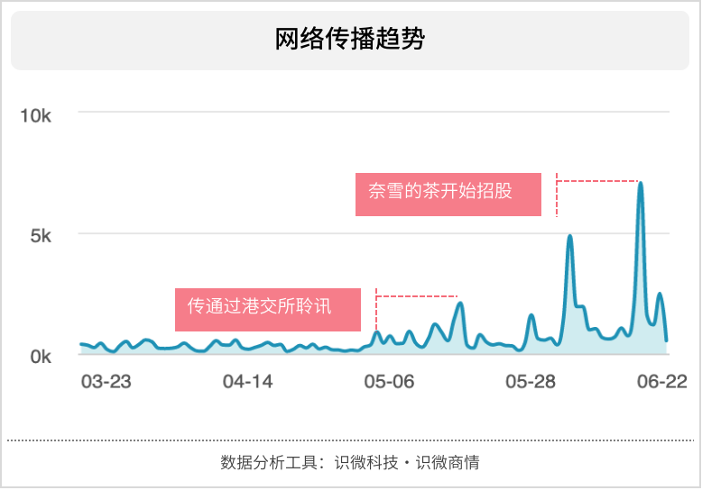 从5月份开始,随着奈雪上市进程不断推进,网络上有关奈雪上市的信息逐渐增多,在奈雪开始招股时达到最高峰。