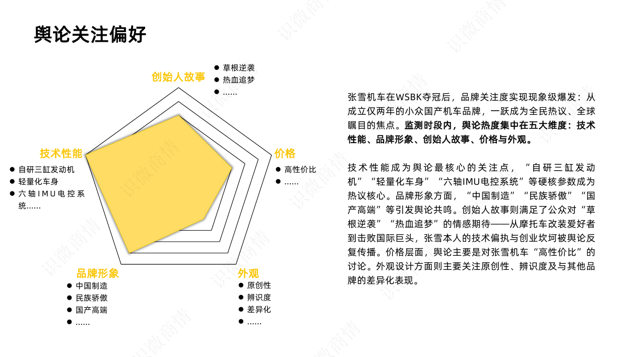 根据识微 AI 定性分析,张雪机车品牌美誉度高达 72.6%。其口碑由以下五个核心维度支撑: