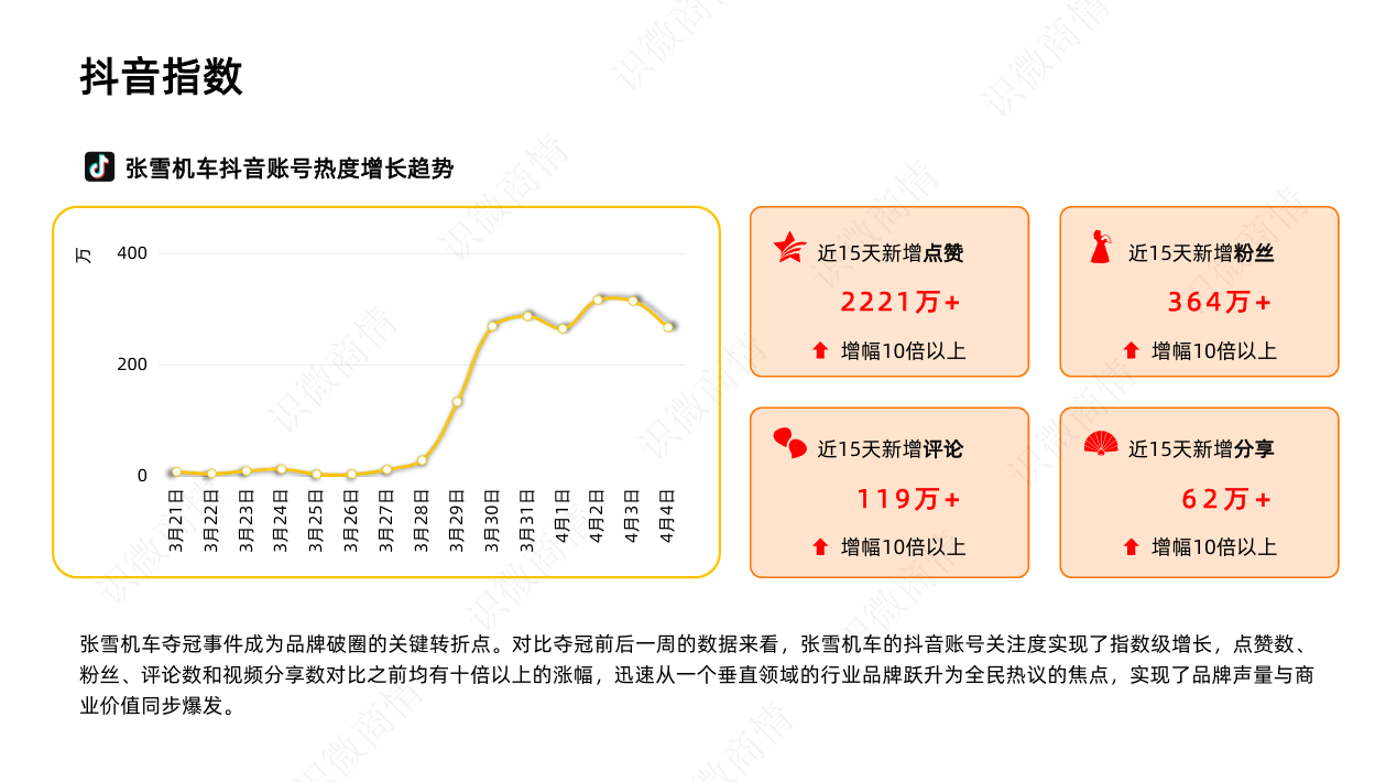 抖音增长: 夺冠后 15 天内,新增粉丝 364 万+,点赞数与评论数均有 10 倍以上涨幅 。