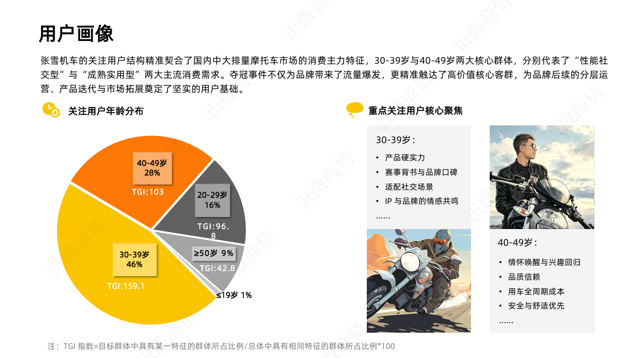 张雪机车的关注用户结构精准契合了国内中大排量摩托车市场的消费主力特征,30-39岁与40-49岁两大核心群体,分别代表了“性能社 交型”与“成熟实用型”两大主流消费需求。
