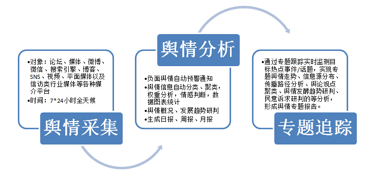 以企业为例,网络舆情的监测先是从舆情的采集开始,然后到分析,再到最后的追踪,形成报告。