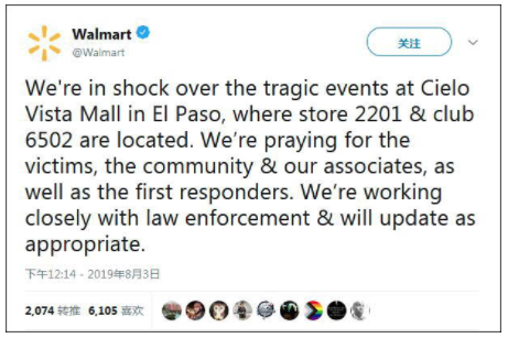 其次就是沃尔玛并没有急于洗白,一心只想把企业摘离出此次事件,而是首先照顾到公众的情绪,表示“我们正在为受害者、社区和我们的同事以及第一事件做出反应的人士祈祷”,并没有大嘴巴的承诺更多或者透露更多,只在合适的时候说合适的话,有效避免了其他衍生危机的爆发。